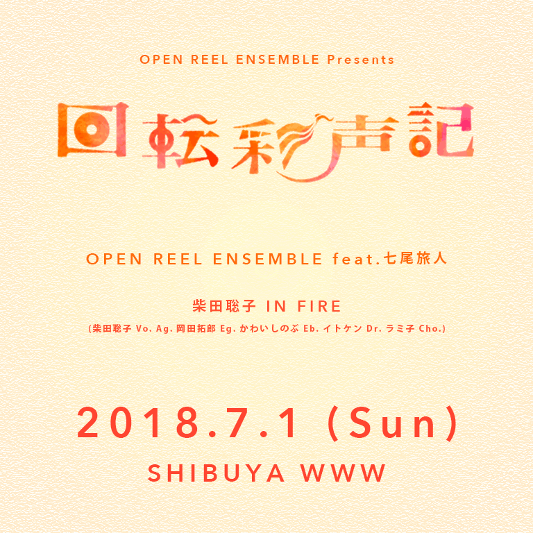 今回はfeatアーティストとして【七尾旅人】さんが参加!オープンリールを駆使した摩訶不思議な生演奏と、七尾さんの彩り溢れる声・歌世界が交差する一夜限りのパフォーマンスをお届けします。 そして、Open Reel Ensembleの吉田悠が学生時代からの友人であり、音楽界のみならず文芸・役者でも活躍の多才アーティスト【柴田聡子】さんのSPバンドセット『柴田聡子 in FIRE』を対バンにお迎え。お見逃しなく!